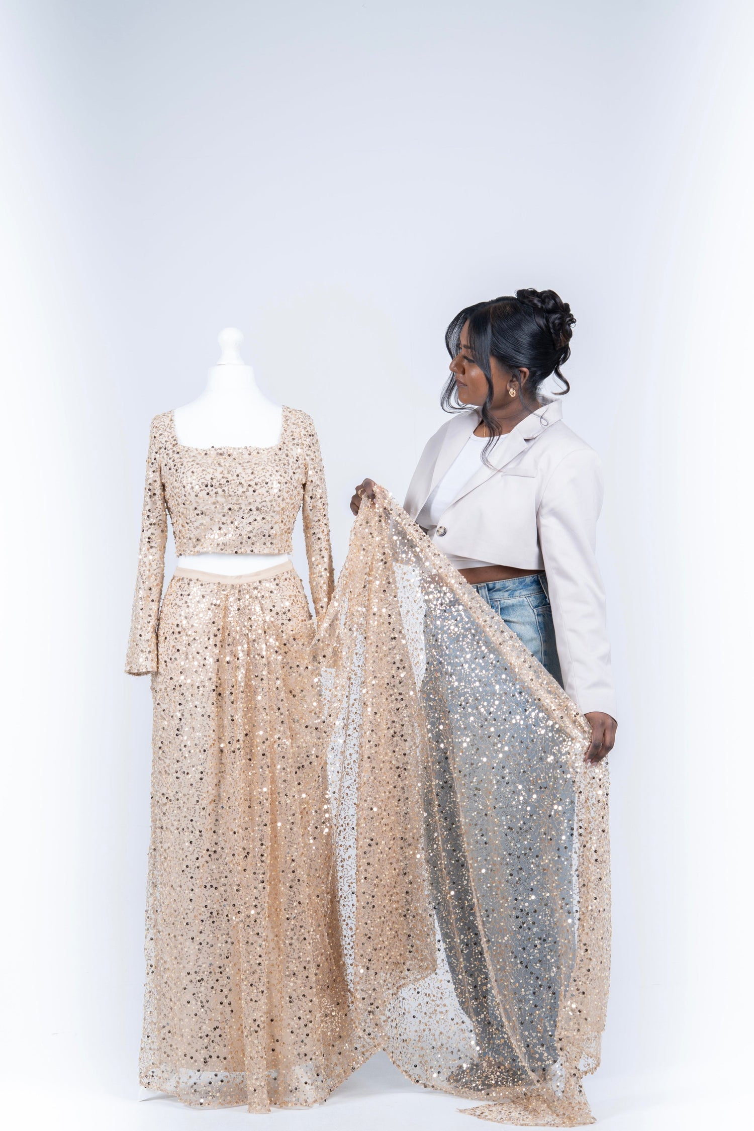 From this vision, Ahithra was born. I personally work on every step of the design process, always considering the female body and how I can create pieces that flatter and help you feel your most confident self. My goal is simple: to ensure you can wear a beautiful saree without the struggle of draping it and feel your best, no matter the occasion.